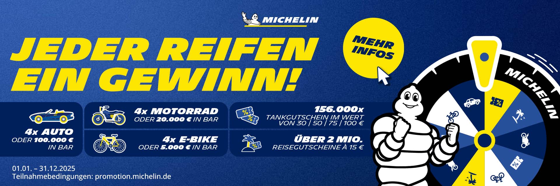 m Aktionszeitraum vom 01.01. - 31.12.2025 erhalten Endverbraucher, die einen MICHELIN Aktionsreifen* (für PKW, LLKW, Motorrad, Scooter oder Roller von 12 bis 23 Zoll) bei einem Reifen1+ Partner kaufen, die Möglichkeit, am Gewinnrad zu drehen. Ein Gewinn ist garantiert. 7.Gewinnen Sie z.B. eins von vier Autos oder 100.000 € in bar, eins von vier Motorrädern oder 20.000 € in bar, oder einen von über zwei Millionen Reisegutscheinen zu je 15 €.